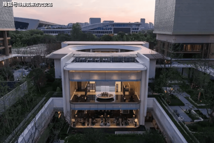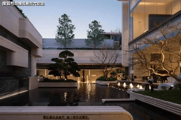 景观设计以运河波光、水声、肌理为灵感,构建了包括入口空间、回廊、下沉庭院及宅间花园在内的体系 。例如,入口处的叠水景观立面拟水流波动形态,中段设叠瀑,模拟运河水势与水声 ;宅间花园以运河支流为灵感,打造蜿蜒溪流,随地形变化为溪瀑、溪潭等景致;中央的圆形水景其基座设计如涟漪状。项目运用了东方传统的“三进归家”礼序来组织空间序列,从入口门庭经水景区域,再到下沉式庭院与会所,形成递进关系