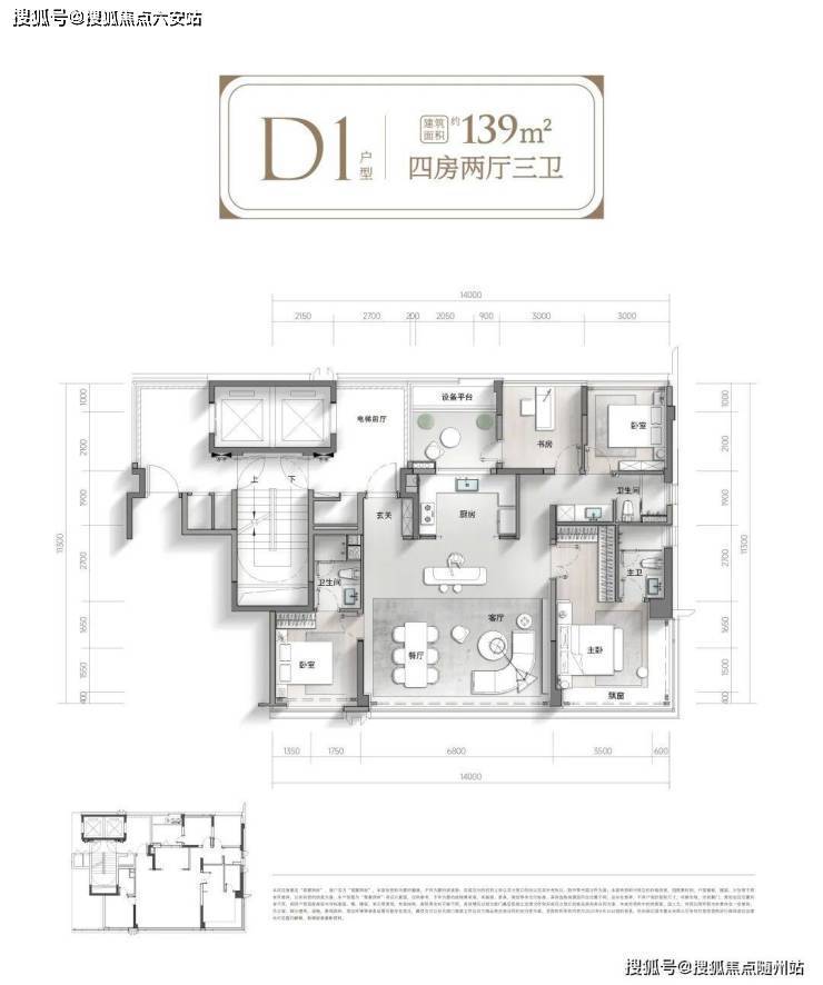 先看建面约139㎡四房三卫户型。LDKB的户型设计;封包阳台+主卧L型飘窗;双套卧、三卫;南向超大开间;专梯专户、尊享电梯前厅...