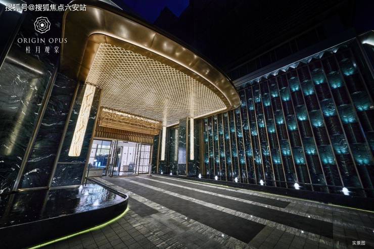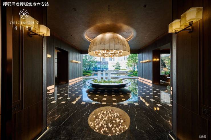 【宋式风华 恢宏门庭】中心满月景观墙,高定液态大理石。门庭入口两侧凯撒灰、普拉达绿奢石景墙。