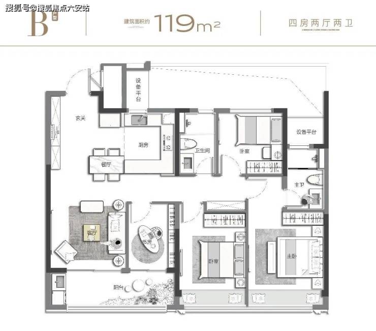 约119㎡改善四房:约12.1米南向超尺面宽,采光充裕,全明室界;约5.6米双开间阳台,自在观景、莳花弄草、品茗对弈,享受生活的闲适与悠然;大尺度客餐厅与半开放式岛台厨房无界相连,形成超大社交生活中心,宴客会友、家庭小聚之间,让彼此情感不断升温。