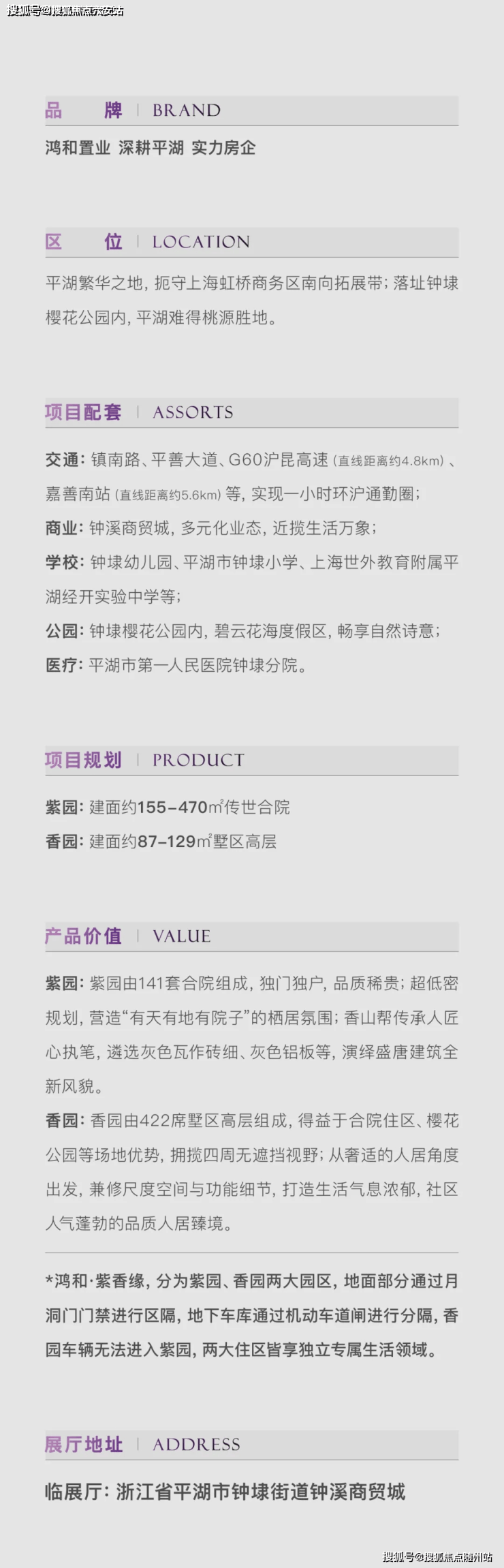 基本信息:楼盘地址在平湖市钟埭街道樱花公园旁(镇南路),开发商是平湖市鸿和置业有限公司。占地面积约 6.6 万平方米,建筑面积约 7.86 万平方米,容积率 0.89,绿化率 30%,车位配比 1:1.68,共 945 个车位,产权年限 70 年。物业公司是浙江中城城市运营服务有限公司,小高层物业费 2.5 元 /㎡・月,别墅物业费 4 元 /㎡・月。项目于 2024 年 9 月 28 日开盘,此前预计 2025 年 12 月整体毛坯交付,合院可提供精装定制服务。