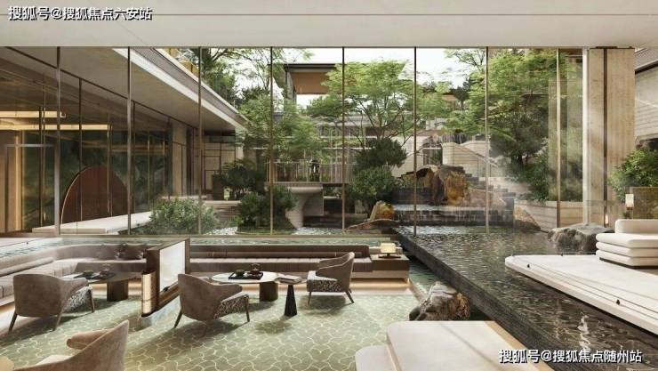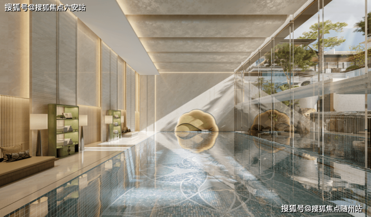 约2000㎡会所由刘荣禄执笔,围绕9米高差中庭设恒温泳池、私宴厅,薄水池从室外漫溢室内,形成“边界消融”美学。