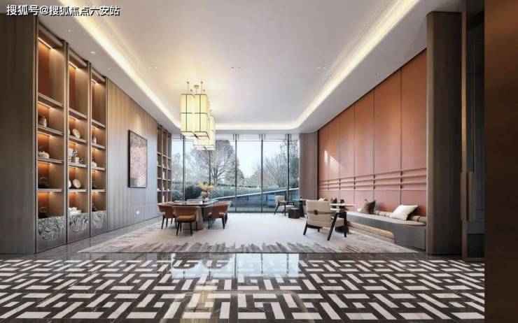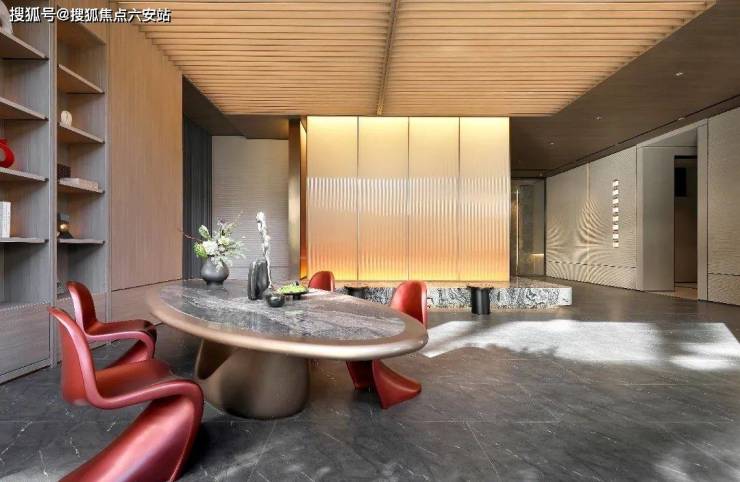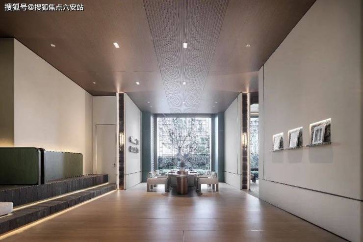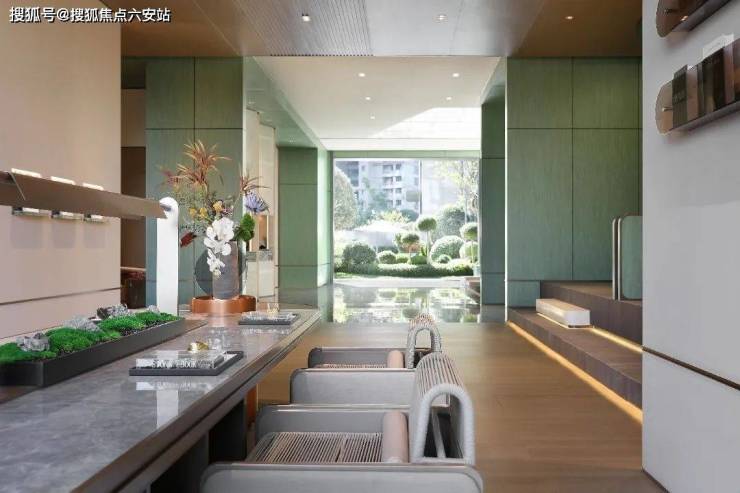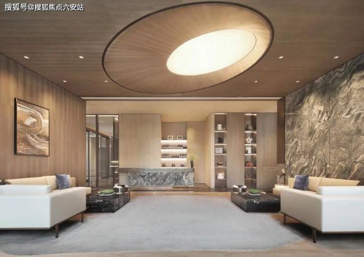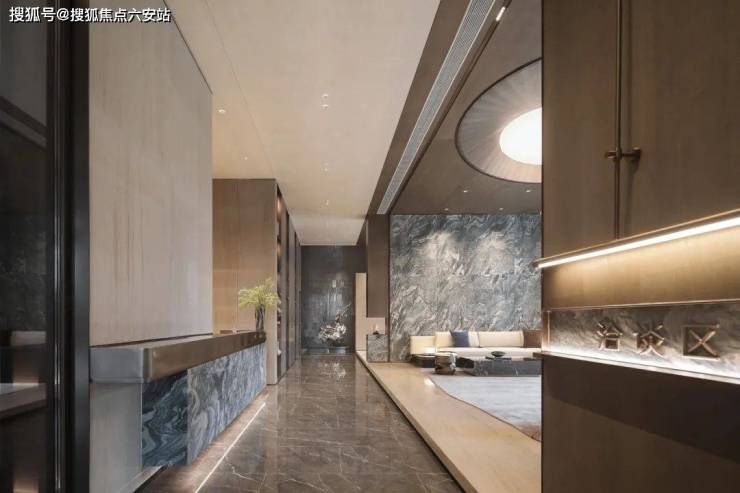 归家礼序上,打造充满仪式感的入户门头和大堂,设计大尺度铝板门檐,搭配中央景观环岛、石材墙面和立柱,营造酒店式归家的仪式感和尊崇感。