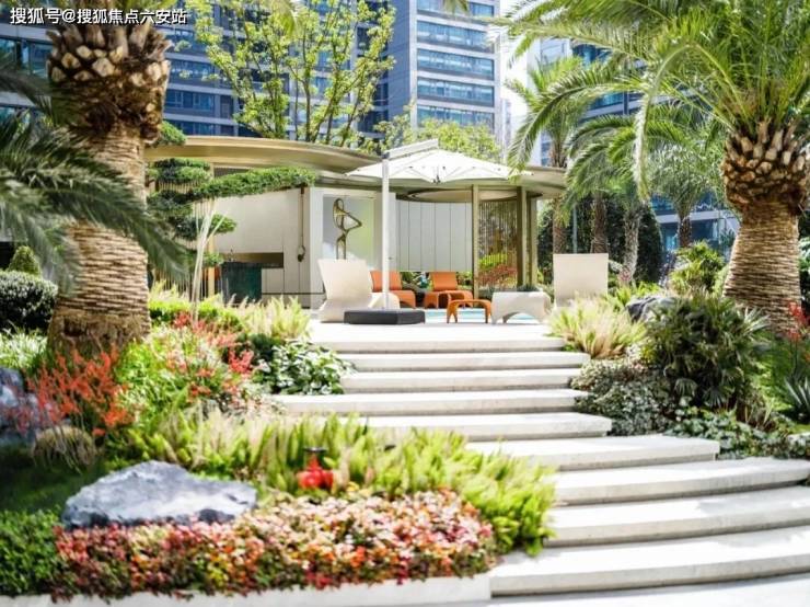 园林造景上,邀请贝尔高林担纲设计,以高成本的堆坡造景,在园区中央打造景观绿岛,列植银海枣、乌桕等高大植被,搭配不规则水池、风景廊架、躺椅和休闲吧,营造浓厚的度假体验感。