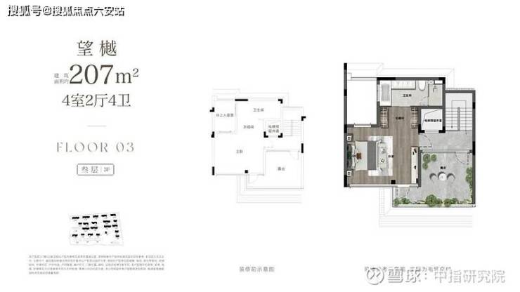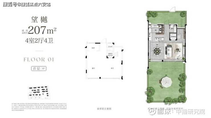 在产品设计上,项目创新实现了大面宽、高「院房比」,拥有极致尺度与通透感。以建面约207㎡四房四卫户型为例,一层客餐厅面宽达约9米(远超杭州上一代排屋约7米的普遍水平)。巨幅落地玻璃取代传统实墙,最大限度引入自然光、清风与庭院景观,实现室内外交融无界。