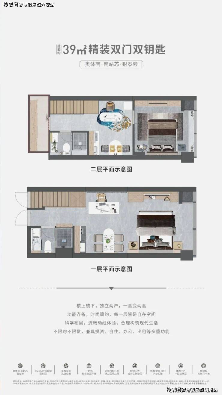双钥匙户型:部分户型采用双钥匙设计,一层变两层,小面积低总价,兼具自住、办公、出租、养老多重功能。