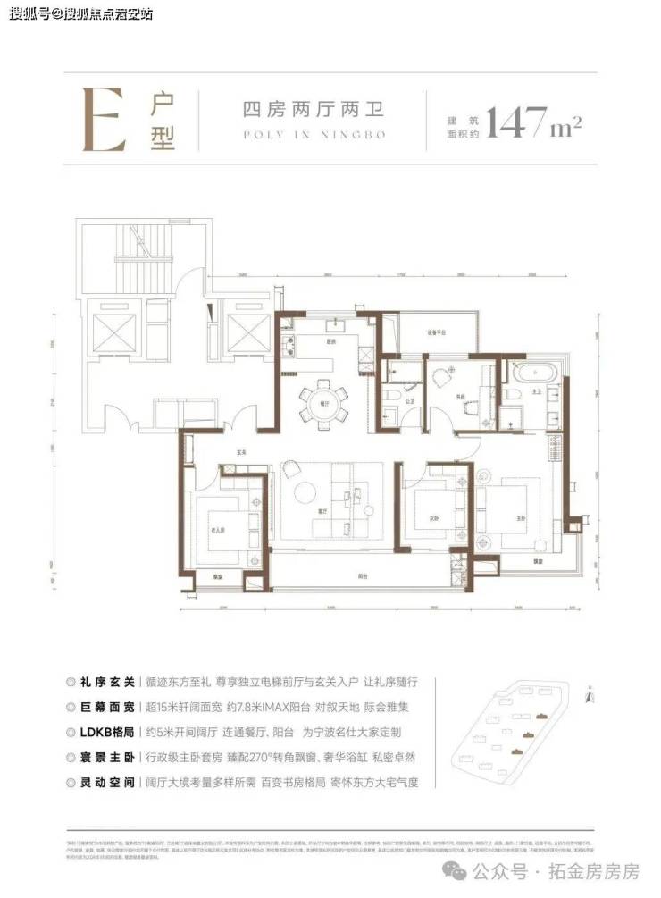 建面约147㎡E户型,奢阔四居,主卧套房 + IMAX级观景阳台,定义高阶改善标准。宁波鄞州老江东◆仇毕未来城◆保利东方瑧悦🔻售楼热线:☎ 400 832 8823「售楼处」☎〢网上售楼中心〢🔻