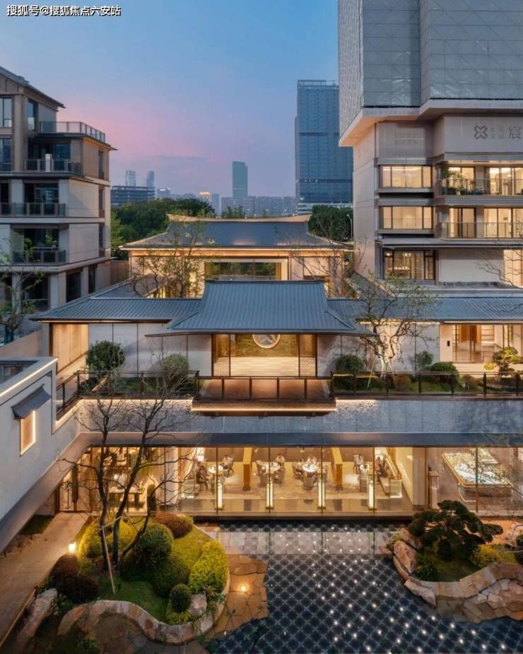 飞鸟屋脊挑檐的高层也自成其景,四面大面铝板+大面宽玻璃,以金线勾边,极具辨识度,如高台楼阁静立园中,进一步升华了宸云的中式禅境。