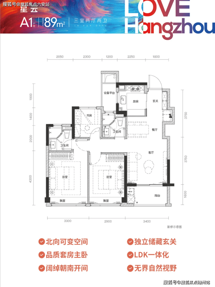 约6米宽景阳台衔接LDK一体化空间,书房可变儿童房,满足成长型家庭需求;