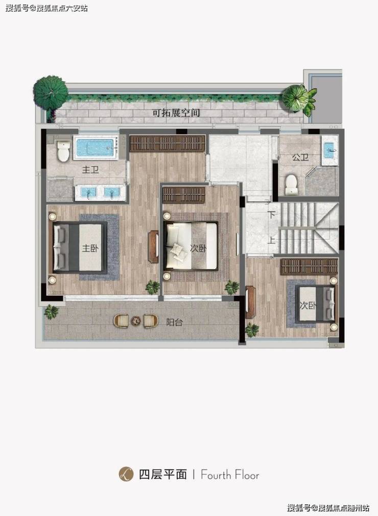 下叠四房两厅三卫的设计。一层南向整体面宽约10.8米,餐客厅一体,连通约7.2米的长阳台,大横厅与落地窗的搭配,增加了室内空间与庭院的互动。
