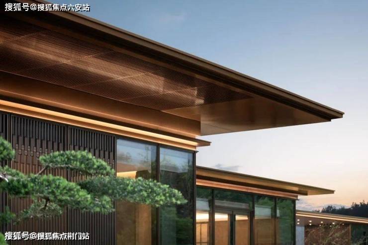 金色铝板挑檐、四面全干挂铝板+三玻两腔玻璃幕墙,搭配仿金丝楠木线条,打造现代与古典交融的“宋风立面”;主入口采用“普拉达绿”奢石与百年罗汉松造景,彰显归家仪式感。