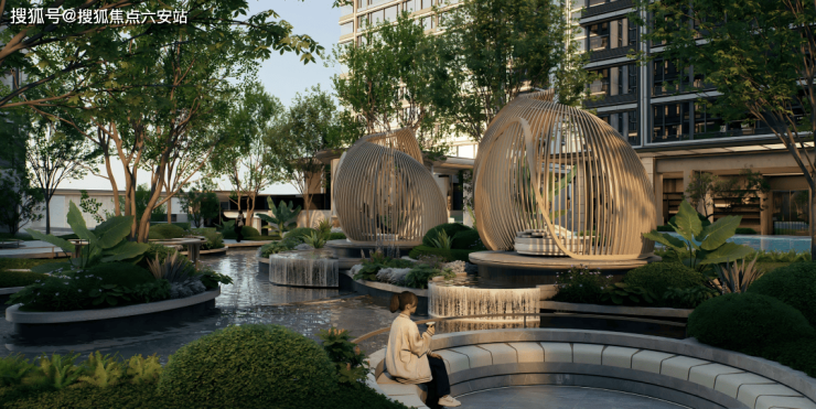 立体的水景庭院,层次分明的绿化、别致的跌水瀑布、主题鲜明的雕塑、以及休憩放松的平台,这些元素巧妙搭配,共同描绘出一幅生机勃勃、流动不息的山水长卷。