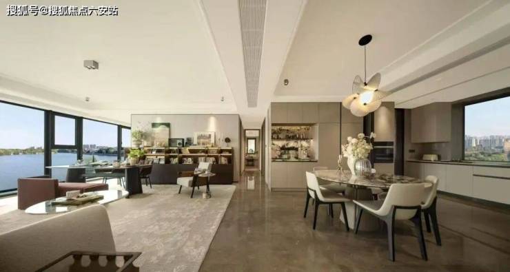 约9.3米超长全景落地窗,像一个画框,把楼下湖水的波光、沿河打造了一条约460米的滨水景观绿堤、远处天际线的轮廓,一并装了进去。