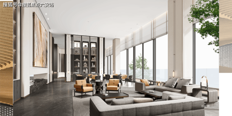 第一重奢阔门厅,巍峨门庭,中轴对称建筑徐徐开篇,中心凌云松迎宾,青松遒劲,气势恢宏;第二重超五星级大堂,近6米高的大堂,整个墙面运用香格里拉酒店专用的黑荒料奢石,碧潭金沙的地面。