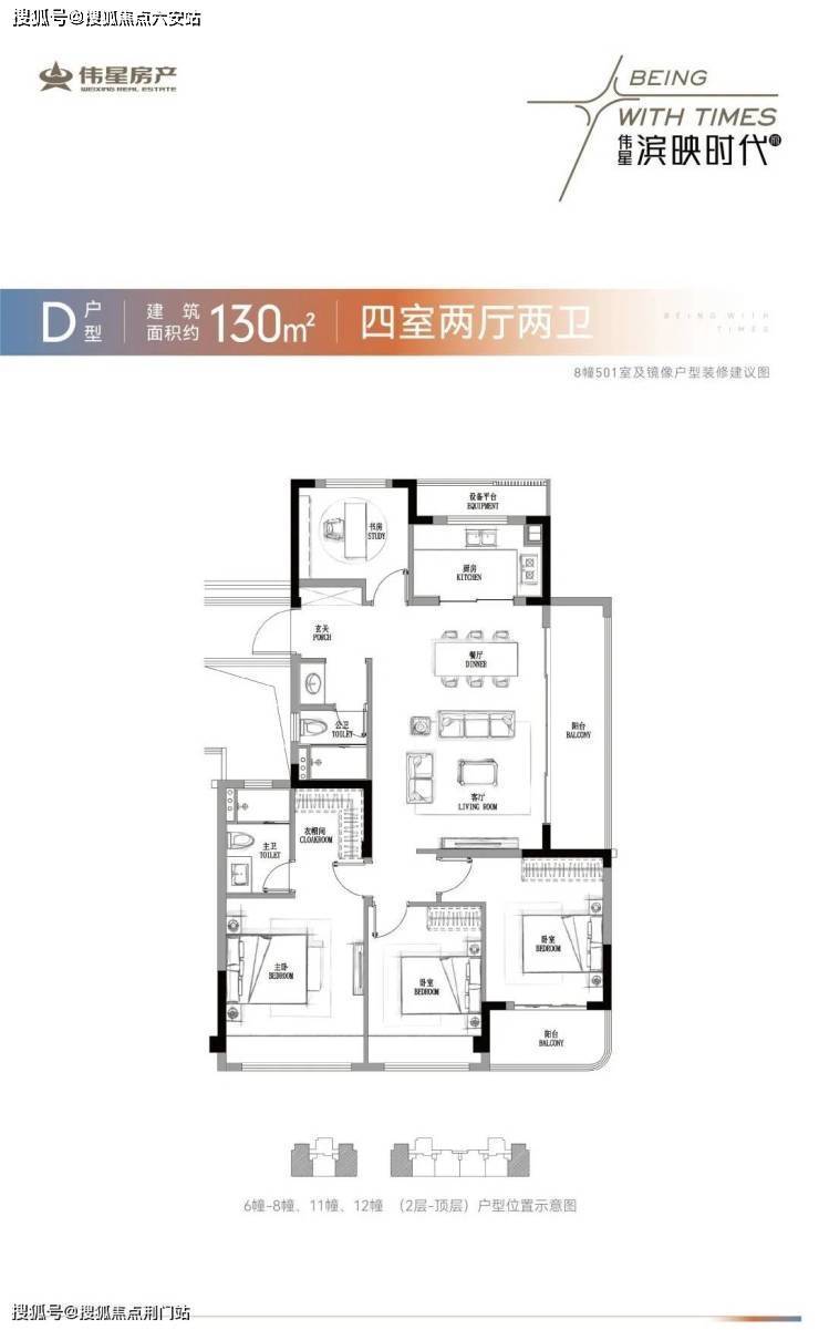 想改善一步到位的购房者还有建面约130方4房:最大的建面约130㎡则是舒适四房格局,这个户型最大的亮点在于双阳台,除了侧边横厅连接一个建面约9㎡的阳台,南面的次卧还连接着一个小阳台。