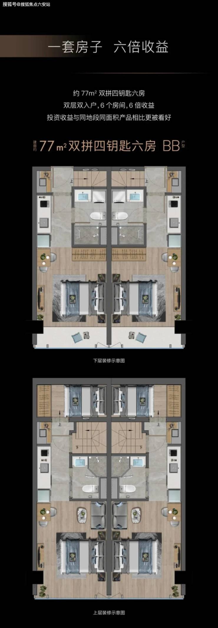77㎡四钥匙跃墅:实得150㎡,适配高端长租或企业会所,年回报率超6%。