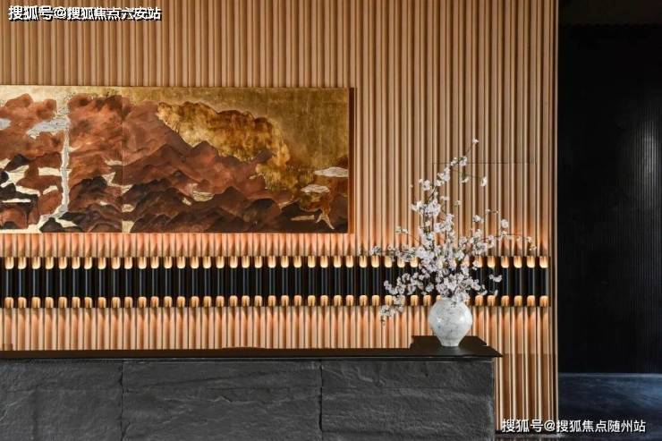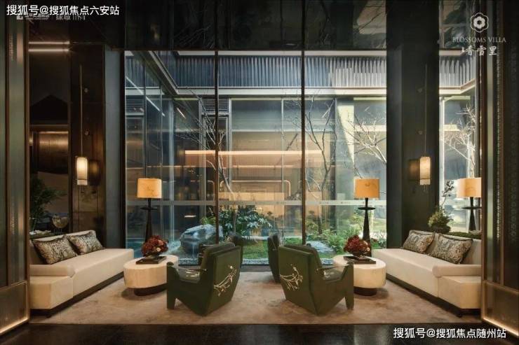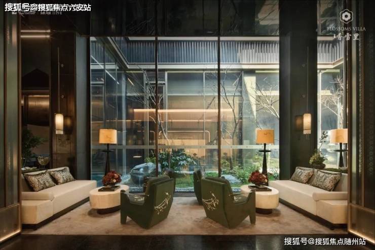 配色和用材都很奢雅,你看大面积景墙是由亚马逊绿奢石打造的,中间金石镶嵌着项目Logo,刻着香雪里的名字,还有超山独有的六瓣梅的图腾,在视觉上就非常惊艳。