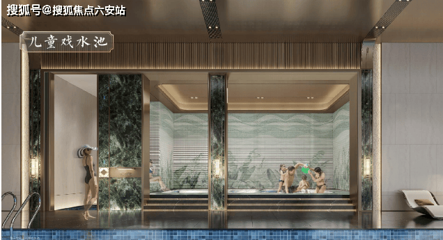 地下恒温泳池:配置了成人标准的泳池(约25*7米),并且单独设置了儿童的戏水空间,健身器材,满足不同年龄层次的需求。设置前台接待大厅,搭配蓝翡翠奢石吧台。