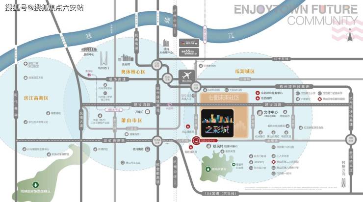 七彩未来社区作为未来社区试点建设“样板间”,打造了A、B、C、D四个组团: A区块便是上文讲到的公交TOD融合公共服务、智慧治理、交通出行、创新创业、邻里共享、文化教育、运动健康等7大场景,已投入使用;B区块则是在建中的创业板块,日益更新;C区块则是规划的住宅用地,也是德信杭州首个未来社区——之彩城。