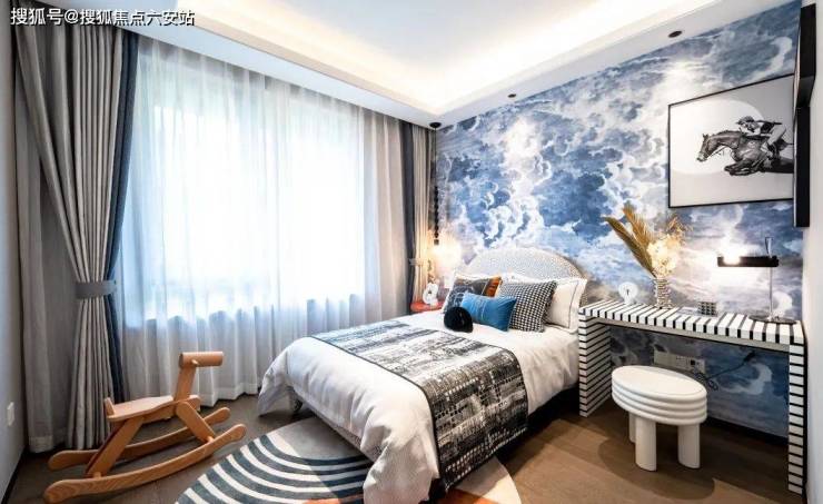 一层公区面积够大,有约48㎡,做了敞开式书房设计,业主也可以根据家庭情况,设计出一间房,可以给到父母居住,既能够免去长辈爬楼梯的劳累,同时能够和上一层主人的房间“距离产生美”。