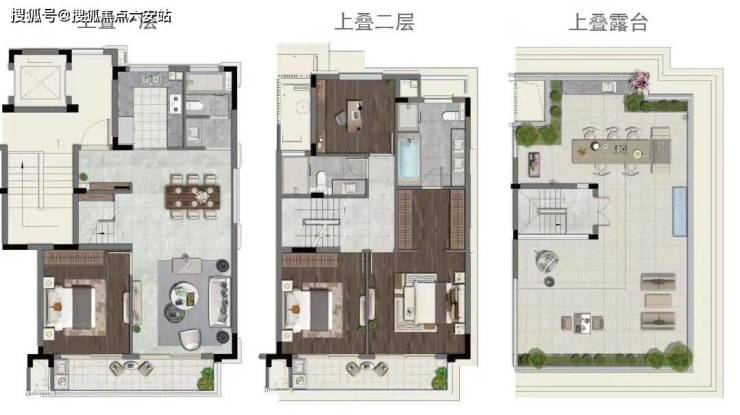 项目上叠188㎡“天空的院子”产品为两层居住空间+一层大露台,实际可得三层,电梯可直达入户。