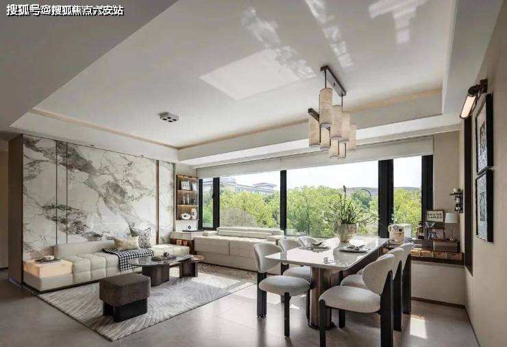 宸岸新月府不仅仅是一个居住空间,更是一个生活方式的革新者。项目内设的艺术会客厅,融合了当下“搭子”社交文化,采用石材和木饰面打造出冷暖碰撞的轻奢基底。金属元素以点线面的形式点缀其间,为空间增添了一份现代精致感。和谐统一的色调体系在视觉冲击中构建出平衡的秩序美学,让人仿佛置身于一个充满艺术与品味的雅致空间。