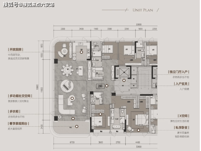 如建面约280㎡“三面端厅”格局:五房两厅四卫。