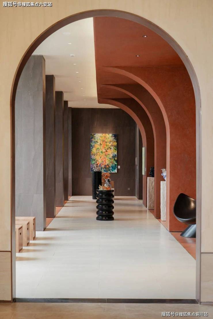 而这仅仅是归家仪式感的开始。业主要绕过景墙,沿着洄游空间,经过悬瀑的水幕,才抵达一扇巨大的紫铜门。