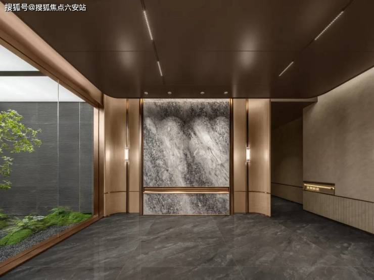 公区配置:仿大理石岩板地面、金属蚀刻屏风、超横屏归家门厅(宽43米)