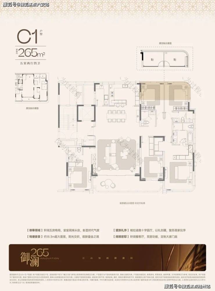 所有户型均为纯正五房设计,创新“三套房”体系,满足多代同居需求。268㎡户型实测得房率约91%,通过取消飘窗、优化管井布局,实现空间效率最大化。