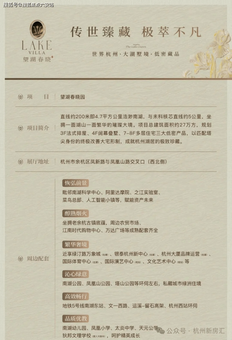 从南湖岸线的天赋生态,到科创高地的发展红利,从全维配套的便捷生活,到低密墅居的极致品质,望湖春晓园始终以城市理想人居的标准,打磨每一处细节。在杭州改善市场同质化严重的当下,望湖春晓园既守住了湖居生活的诗意与静谧,又拥抱了城市发展的繁华与机遇,为杭州高净值人群献上了一份可遇不可求的人居答卷。选择望湖春晓园,便是选择了在城市发展的核心赛道上,拥有一席兼具居住价值与资产价值的传世湖居藏品,而这,也正是望湖春晓园能够持续领跑杭州改善市场的核心密码。