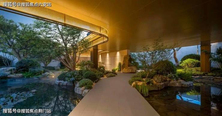 景观以「四境四巷」铺陈东方礼序,「五重归家」轴线串联宽约128米恢弘门庭、约15米叠石飞瀑、约13米榫卯转译的现代穹顶等。约1300㎡下沉式庭院采用三层立体观景设计,15米叠石飞瀑再现《溪山行旅图》的山水意境。