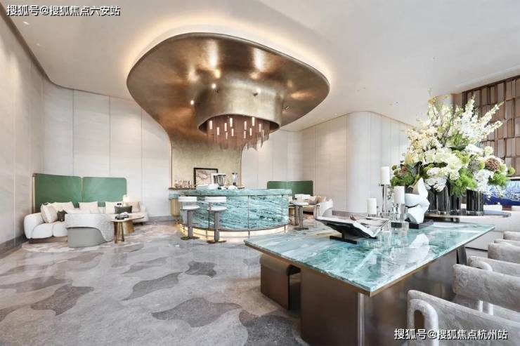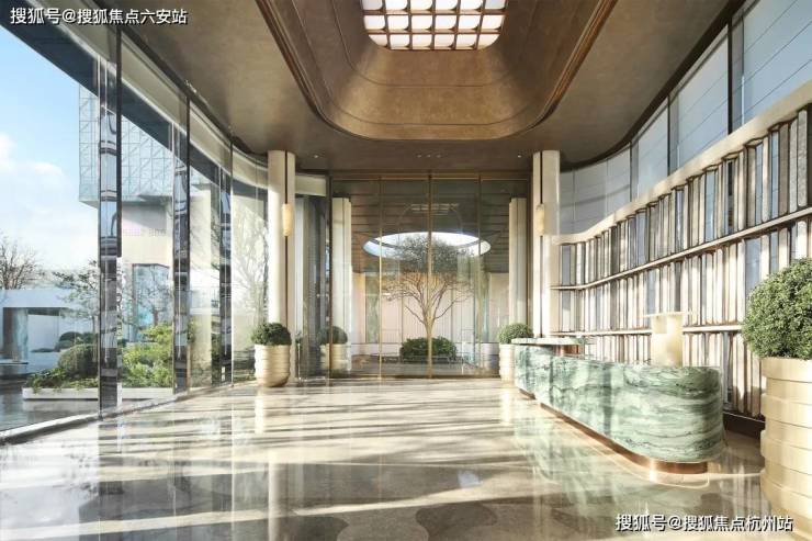 这处门庭采用贝金米黄石材、维多利亚绿、白雪公主奢石,结合古铜色金属板,形成冷暖撞色的张力美学,打开了城市奢度,每个细节透露出“贵”。