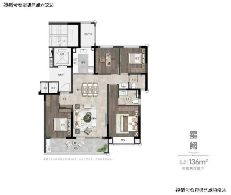 另一款建面约136平户型,为四房二厅二卫设计,全部排列于项目南侧,南向的空间视野与采光性都非常出色。