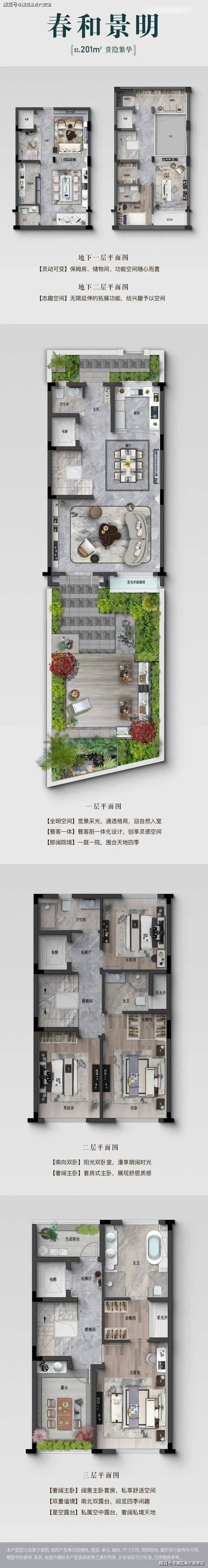 户型设计精巧,建面约201㎡的“春和景明”户型一楼空间方正大气,客厅开间约6.6米,直通约66㎡户外大花园;二楼设计了三间卧室,其中两间为套房;三楼整层为主人私享空间。而建面约259㎡的“四季芳华”边套户型,南向入户即拥有约140㎡私家庭院,二楼创新性地设计了三间套房,可满足三孩家庭的居住需求。