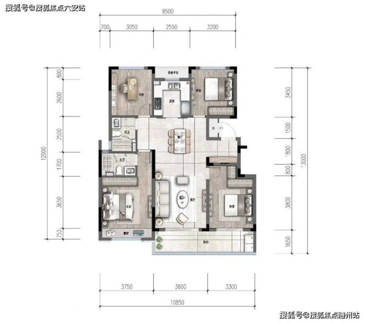 127㎡四叶草四房:四开间朝南,南向7.1米景观阳台,主卧套房+独立玄关,最小房间面宽3.05米,三代同堂无压力。