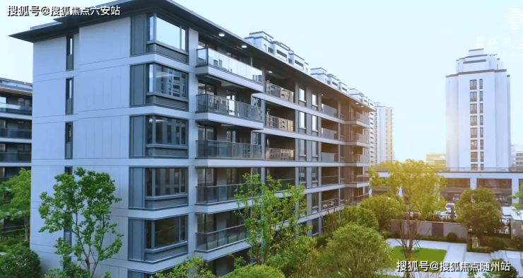 从楼盘现场来看,低密洋房的颜值非常高,6层楼的洋房,青灰色的外墙,深色玻璃幕墙,贯通式阳台,整体大气、开放。