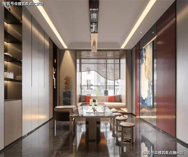 装修标准6500-8000元/㎡,配置汉斯格雅卫浴、杜拉维特五金、西门子厨电,地面通铺天然石材与威斯岩板背景墙。