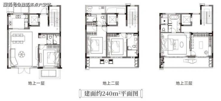 建面约240㎡的中间套:同样是大四房格局,二三楼都有宽约8.9米的跑道式阳台,四季美景循环播放。