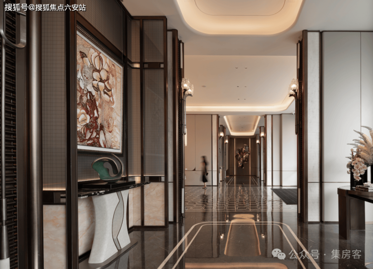棠悦芳华轩大门实景:萃取东方礼制精髓,沿东西向主轴设置多重归家院落,形成主入口至迎宾水院及度假水池为一体的礼序归家轴。层层递进的空间,在步移景异中,营造出多重归家仪式。