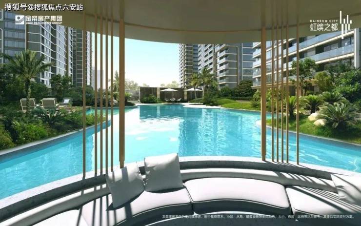 已经实景呈现的蒂芙尼蓝中心戏水池,水池边一道道弧形曲线,池底精致的马赛克拼花,透着满满的热带度假风,在配上水池旁挺拔的银海枣等热带植物,未来业主们往水池边一趟,仿佛就置身在东南亚的海滩边的高级度假酒店。