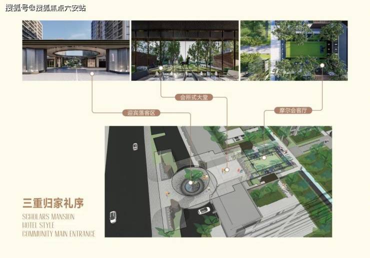 三重礼序 尊崇归家之路汲取四季酒店设计精髓,于社区主入口打造豪华酒店大堂式归家设计,以迎宾落客区--会 所式大堂--摩尔会客厅的渐进式排布,勾勒出入境--入画--归影的三重归家仪制。