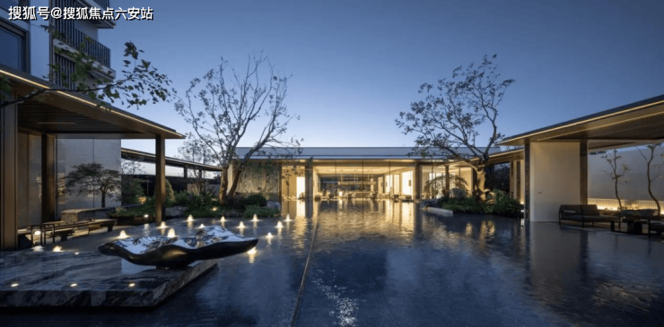 公区设计:公区已经实景呈现,进入公区首先看到的是长约40米的恢弘大门,用了大半年时间打磨而成。大门两旁铺装了大片的Prada绿奢石,使用金属线条包边,简约中又显高贵。整个园区还散落着超40多块大大小小的黑山石,也是一大景观亮点。