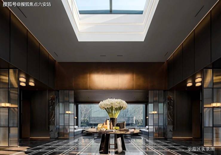 空间横平竖直的经典制式,顶部镂空天井设计, 金色光线弥漫入大大堂, 与黑金面板交相辉映, 气度丰盈而尊贵。
