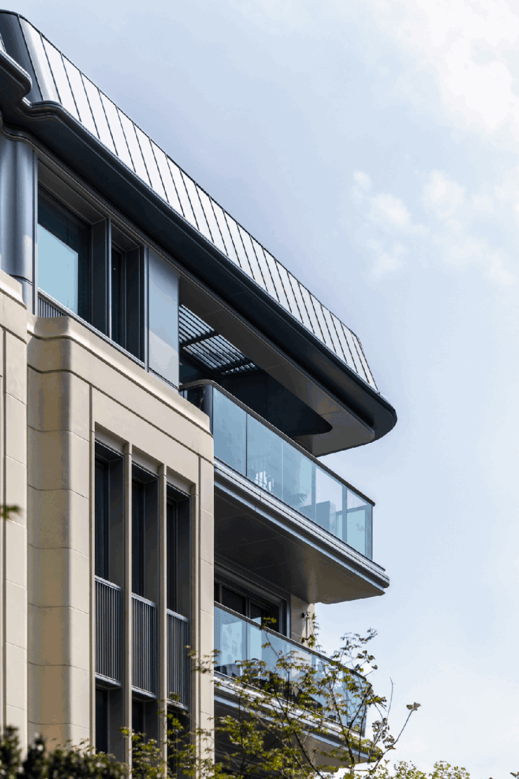 建筑立面汲取西湖北山街民国建筑灵感,以三段式构图融合米色莱姆石、暖色铝板与景泰蓝奢石线条,搭配类孟莎式坡屋顶,塑造兼具复古韵味与现代感的视觉语言。园林由蓝颂景观首席设计师宋淑华执笔,以法式中轴序列布局镜面水池、回廊与名贵乔木,移植70年老桩紫薇、丹桂等珍稀树种,形成“一步一景”的沉浸式艺术园林。
