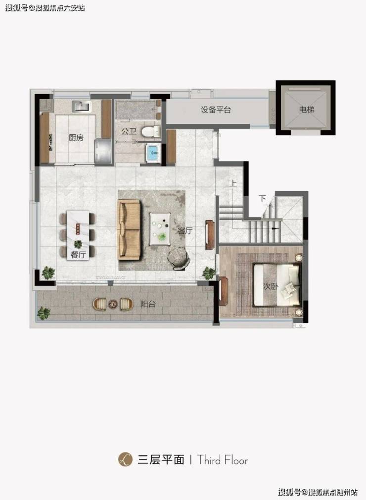 下叠四房两厅三卫的设计。一层南向整体面宽约10.8米,餐客厅一体,连通约7.2米的长阳台,大横厅与落地窗的搭配,增加了室内空间与庭院的互动。