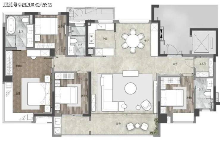 朗云「天际」的建面约200㎡户型堪称「全景舱」大平层,实现了从"居住空间"到"云端观景台"的升维,每一处转角都是精心计算的视觉陷阱。