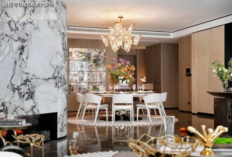 对于高净值客群来说,客餐厅需要「方圆双全」。建筑面积约365平米户型拥有宽约13米的大横厅,不仅可以放得下约10人座的大圆桌,又可以放得下长桌,形成与客厅对望的开放式书房。
