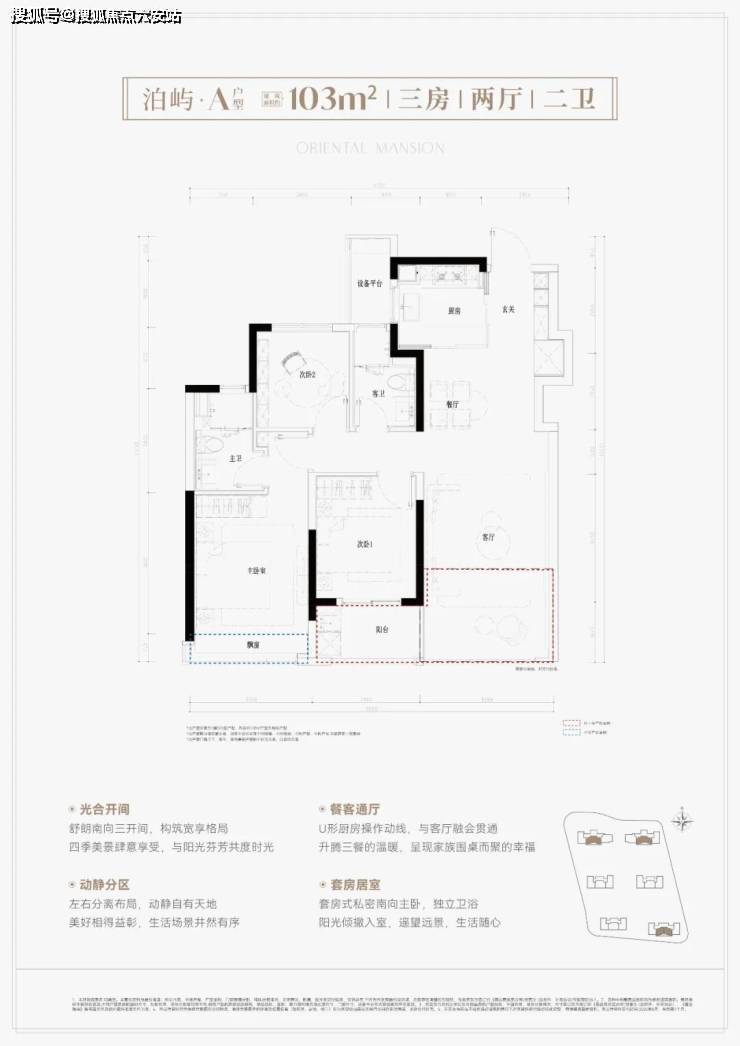 建面约103平,三房两厅两卫。三大亮点分析:① 南向三开间,朝南次卧带阳台,客厅联通阳台后,空间阔绰;② U型厨房且半开放设计,玄关含S墙冰箱位,利用率高、采光更优;③ 新规户型得房率高达约90%以上。