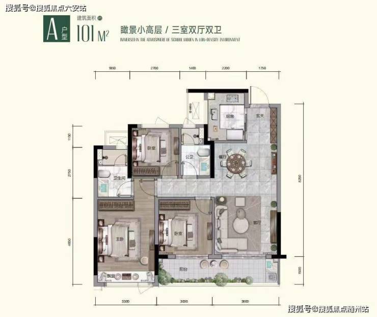 A2户型的优点大开间客厅,衔接观景飘窗,通透明亮,主卧尊享独立明卫,南向飘窗采光充足,南向次卧链接外阳台,窗外美景一览无余,时尚三房空间,彰显高性能舒居价值。